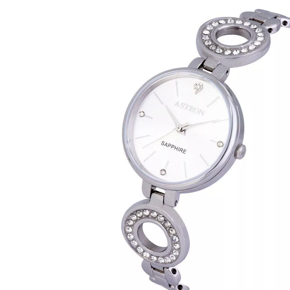 Materijal kućišta sata Astron ženski sat 8029-8 je nerđajući čelik, njegova boja je srebro, materijal kaiša je nerđajući čelik i njegova boja je srebro. Prečnik kućišta sata je 28 mm, njegov oblik je točak. Staklo sata je safir (bez ogrebotina), njegov mehanizam je kvarc i njegova vodootpornost je 3 atm (30m) (bez kapanja).