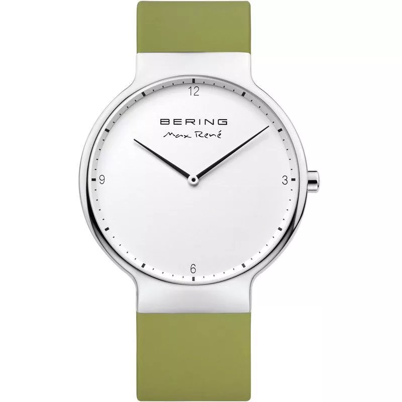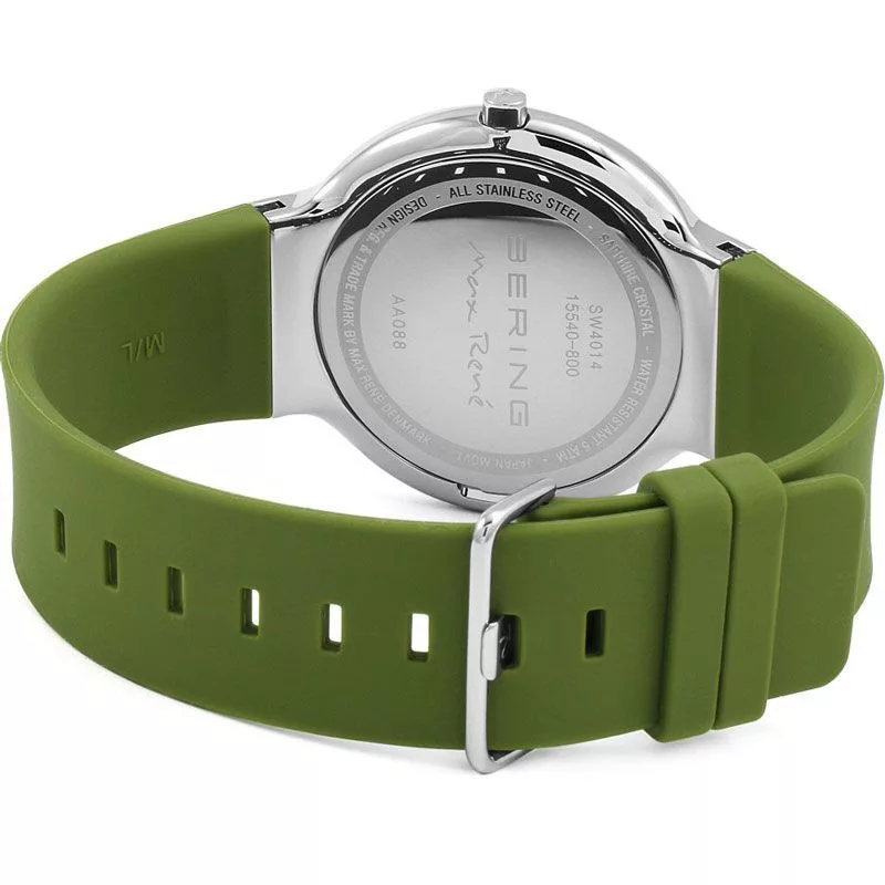 Materijal kućišta sata Bering Max Rene muški sat 15540-800 je nerđajući čelik, njegova boja je srebro, materijal kaiša je silicijum i njegova boja je zelen. Prečnik kućišta sata je 40 mm, njegov oblik je točak. Staklo sata je safir (bez ogrebotina), njegov mehanizam je kvarc i njegova vodootpornost je 5 atm (50m) (visoka otpornost na padove).