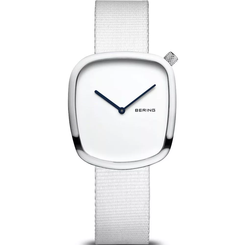 Materijal kućišta sata Bering Ocean Pebble ženski sat 18034-007 je nerđajući čelik, njegova boja je srebro, materijal kaiša je fabric i njegova boja je beo. Prečnik kućišta sata je 30 mm, njegov oblik je eliptični. Staklo sata je safir (bez ogrebotina), njegov mehanizam je kvarc i njegova vodootpornost je 3 atm (30m) (bez kapanja).