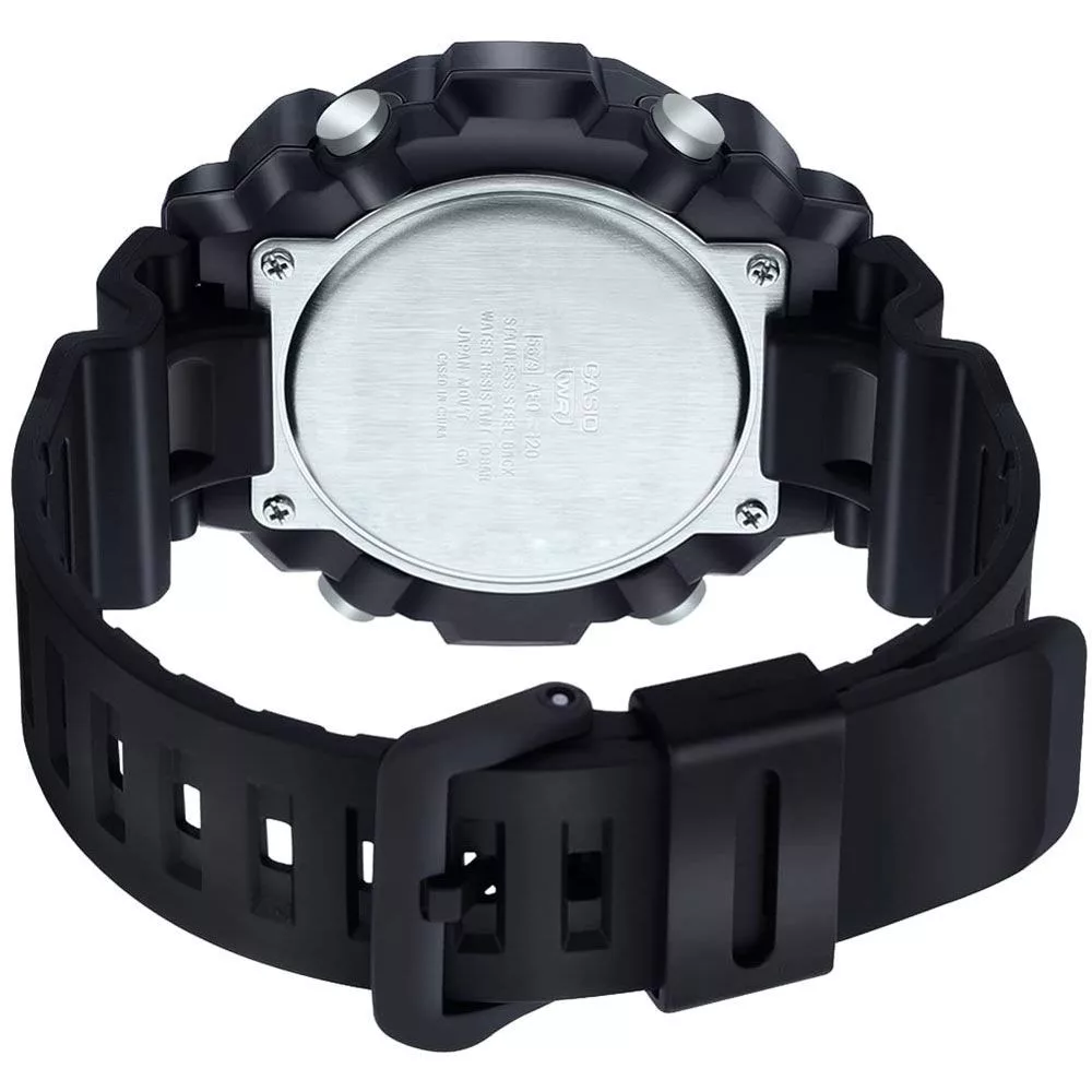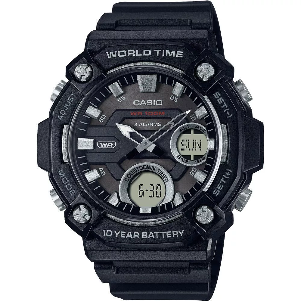 Materijal kućišta sata Casio Collection muški sat AEQ-120W-1AVEF je plastika, njegova boja je crn, materijal kaiša je plastika i njegova boja je crn. Prečnik kućišta sata je 52 mm, njegov oblik je točak. Staklo sata je pleksiglas (plastika), njegov mehanizam je kvarc i njegova vodootpornost je 10 atm (100m) (pogodno za plivanje).