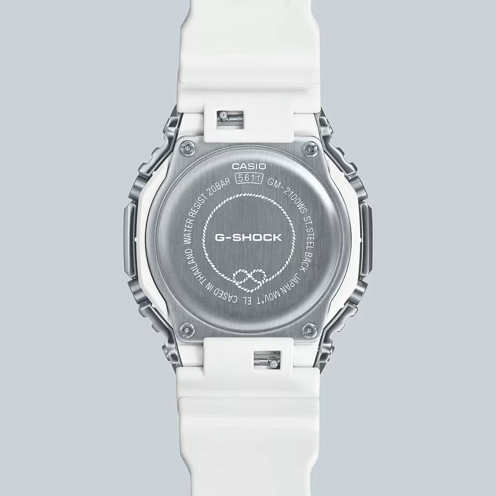 Materijal kućišta sata Casio G-Shock Seasonal Collection muški sat GM-2100WS-7AER je nerđajući čelik, njegova boja je srebro, materijal kaiša je plastika i njegova boja je beo. Prečnik kućišta sata je 44 mm, njegov oblik je točak. Staklo sata je kristal (teško je ogrebati), njegov mehanizam je kvarc i njegova vodootpornost je 20 atm (200m) (pogodno za ronjenje).