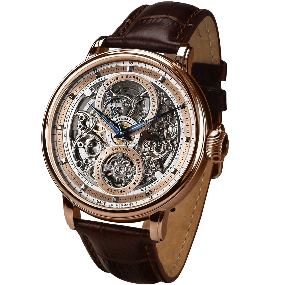 Materijal kućišta sata Poljot International Hermitage muški sat 7500.1940613 je nerđajući čelik, njegova boja je rose gold, materijal kaiša je koža i njegova boja je braon. Prečnik kućišta sata je 43 mm, njegov oblik je točak. Staklo sata je safir (bez ogrebotina), njegov mehanizam je mehaničko ručno namotavanje i njegova vodootpornost je 5 atm (50m) (visoka otpornost na padove).