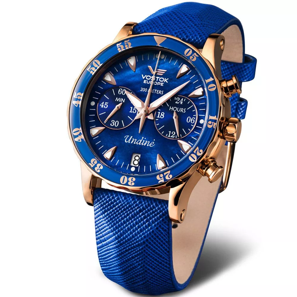 Materijal kućišta sata Vostok Europe Undiné ženski sat VK64-515B670-B je nerđajući čelik, njegova boja je rose gold, materijal kaiša je Szilikon,Nemesacél,Bőr i njegova boja je Kék,Rose gold. Prečnik kućišta sata je 39 mm, njegov oblik je točak. Staklo sata je kristal (teško je ogrebati), njegov mehanizam je kvarc i njegova vodootpornost je 20 atm (200m) (pogodno za ronjenje).