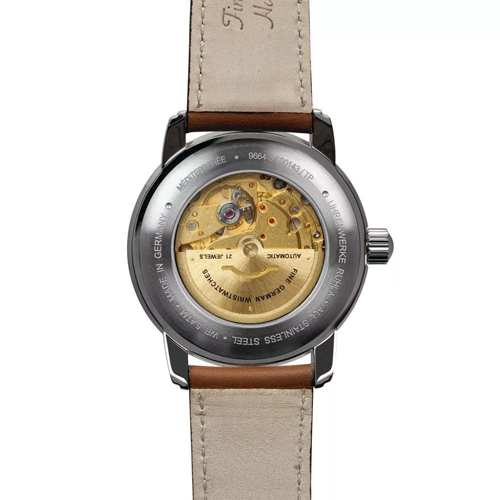 Materijal kućišta sata Zeppelin 100 Yahre Méditerranée muški sat 9664-5 je nerđajući čelik, njegova boja je srebro, materijal kaiša je koža i njegova boja je braon. Prečnik kućišta sata je 41 mm, njegov oblik je točak. Staklo sata je kristal (teško je ogrebati), njegov mehanizam je automatski i njegova vodootpornost je 5 atm (50m) (visoka otpornost na padove).