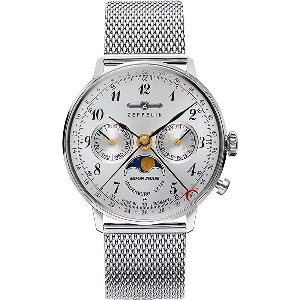 Materijal kućišta sata Zeppelin LZ129 Hindenburg ženski sat 7037M-1 je nerđajući čelik, njegova boja je srebro, materijal kaiša je nerđajući čelik i njegova boja je srebro. Prečnik kućišta sata je 36 mm, njegov oblik je točak. Staklo sata je pleksiglas (plastika), njegov mehanizam je kvarc i njegova vodootpornost je 3 atm (30m) (bez kapanja).
